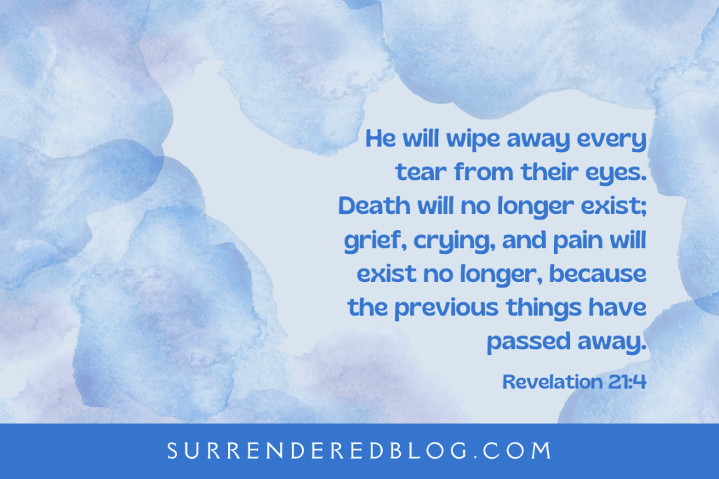 He will wipe away every tear from their eyes. Death will no longer exist; grief, crying, and pain will exist no longer, because the previous things have passed away.